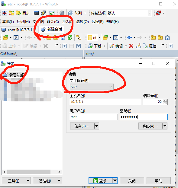 如下图:点击新建会话,再点击新建站点,主机名输入10.7.7.1 端口22,用户名root,密码password